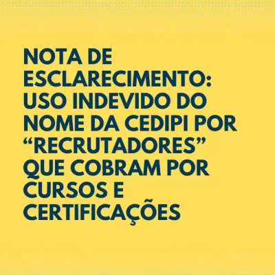 A CEDIPI vem a público alertar sobre tentativas de golpe envolvendo o uso indevido do nome da empresa. Temos recebido relatos de pessoas que estão sendo contatadas por falsos recrutadores, que afirmam oferecer vagas de emprego na CEDIPI, mediante a realização de cursos pagos ou certificações como requisito para participação...